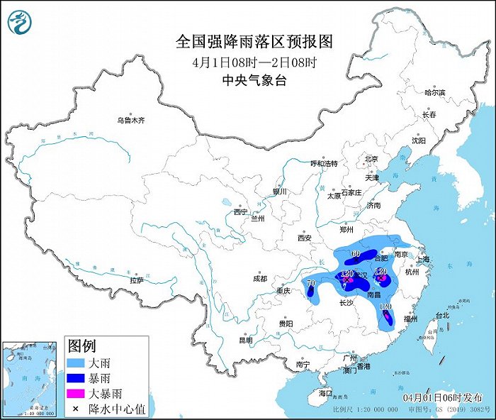预计,4月1日08时至2日08时,河南南部、安徽西部和南部、江苏西南部、湖北东部和南部、湖南北部、江西中北部、福建西部、重庆东南部等地部分地区有大到暴雨,其中,安徽南部、湖北东南部、湖南东北部、江西北部、福建西部等地局地有大暴雨(100~120毫米)。上述部分地区伴有短时强降水(最大小时降雨量30~50毫米,局地可超过70毫米),局地有雷暴大风等强对流天气。