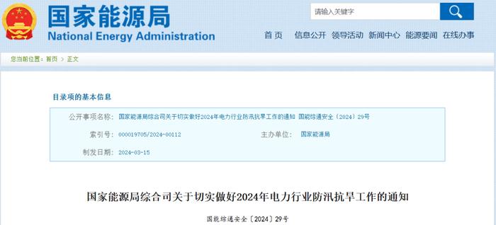 3月26日,国家能源局综合司发布《关于切实做好2024年电力行业防汛抗旱工作的通知》。