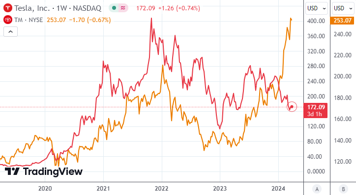 需要指出的是,Jonas原本是一位长期看好特斯拉的分析师,他的立场变化具有关键的意义。年初至今,丰田汽车美股累涨超37%,日股涨逾47%,与此同时,特斯拉却跌超30%,成为美股“七巨头”中的差生。