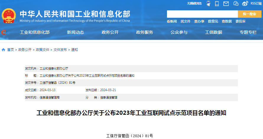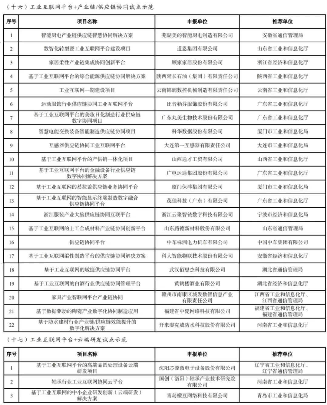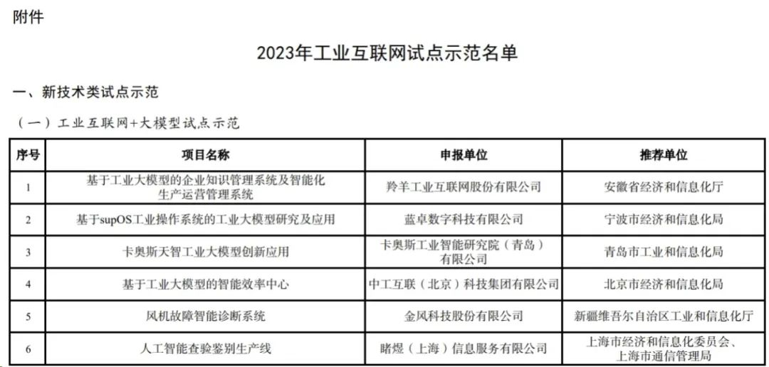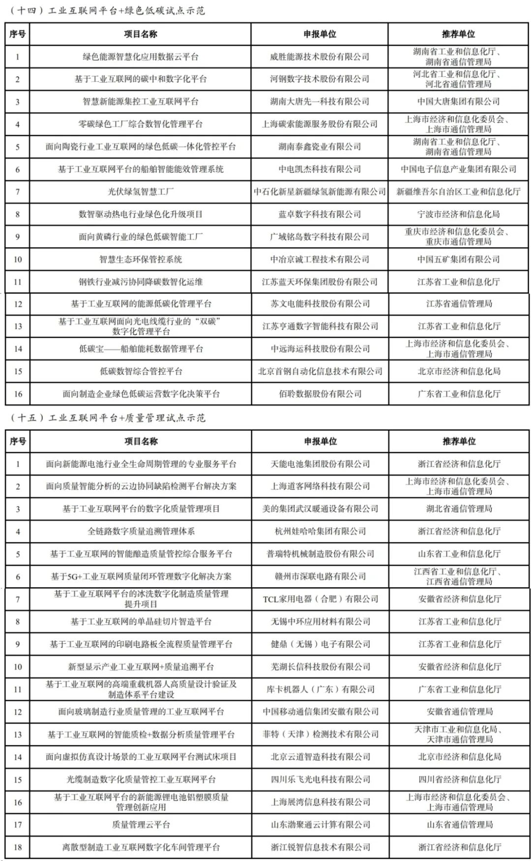 根据《工业和信息化部办公厅关于组织开展2023年工业互联网试点示范项目申报工作的通知》(工信厅信管函〔2023〕319号)要求,经企业自主申报、地方推荐、专家评审和网上公示,确定了2023年工业互联网试点示范项目名单,现予以公布。
