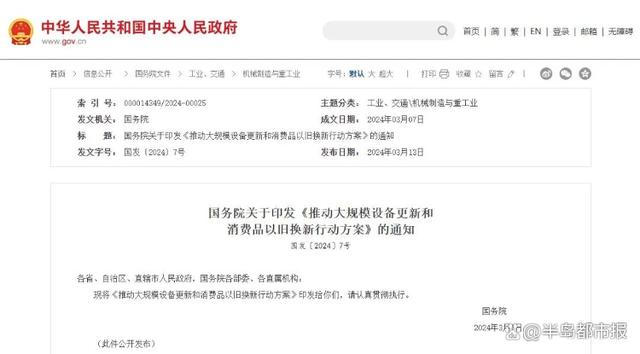 3月13日,国务院印发《推动大规模设备更新和消费品以旧换新行动方案》,明确实施消费品以旧换新行动,开展汽车、家电产品以旧换新,推动家装消费品换新。