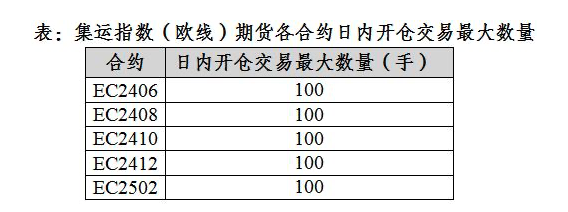 3月18日,上海国际能源交易中心公告,根据《上海国际能源交易中心风险控制管理细则》的有关规定,经研究决定,自2024年3月20日(周三)交易起,非期货公司会员、境外特殊非经纪参与者、客户在集运指数(欧线)期货合约日内开仓交易的最大数量如下。