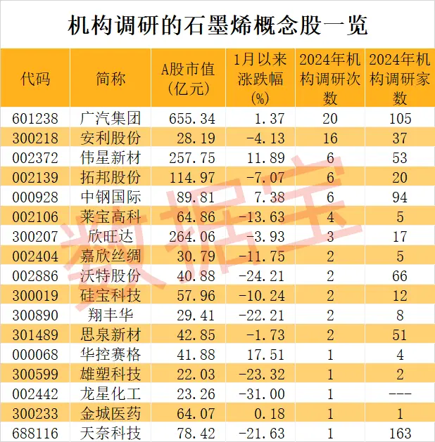 机构调研信息是投资者了解上市公司最新产业布局的重要来源之一。数据宝统计,今年以来合计17只石墨烯概念股迎来机构调研,其中广汽集团、安利股份、伟星新材、拓邦股份、中钢国际获调研频次排在前五位。
