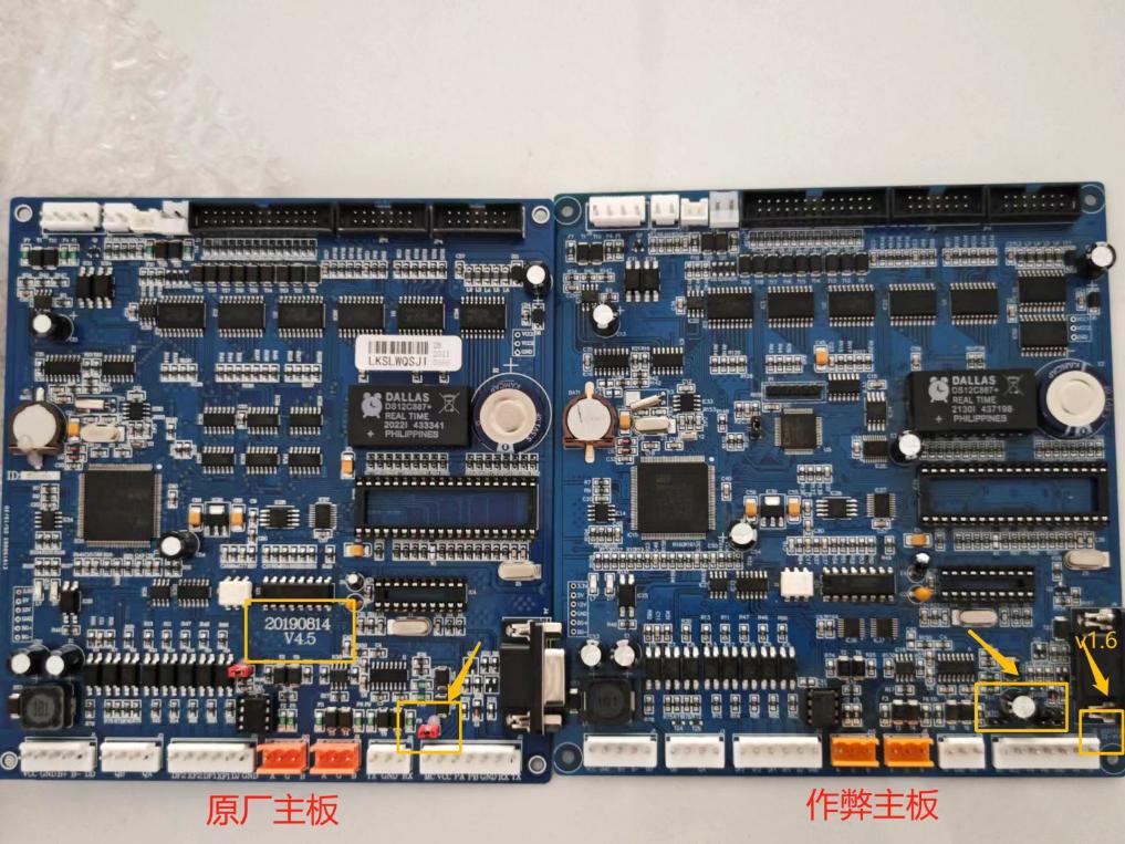 加油机原厂计控主板和非原厂主板对比图。(重庆市市场监管综合行政执法总队供图)