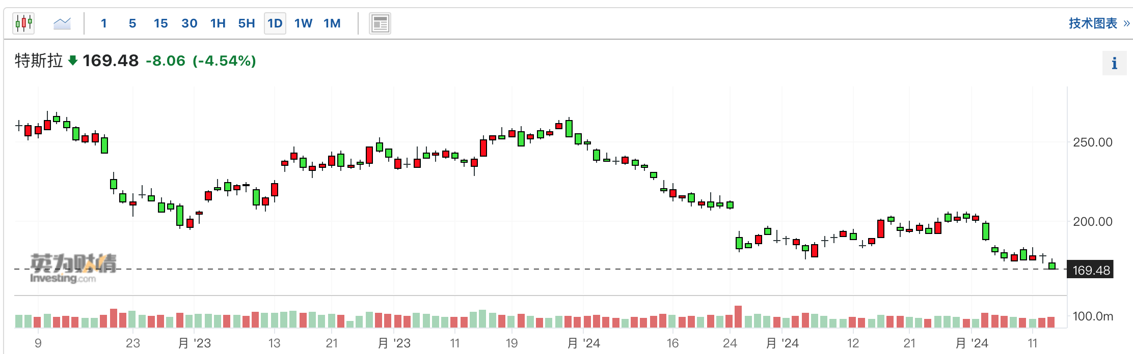 受富国银行下调评级的影响,特斯拉股价周三收跌4.54%,报169.48美元/股。