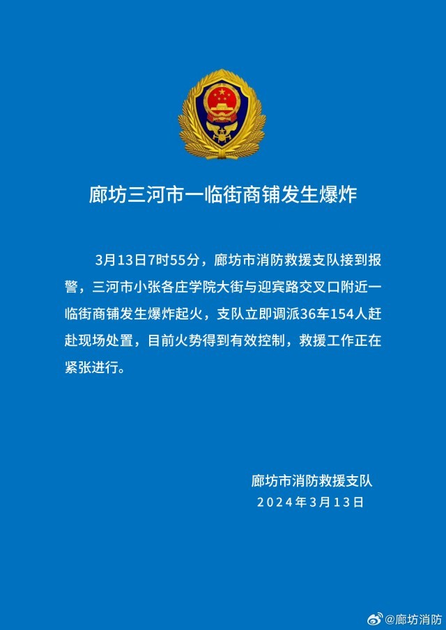 央视网消息:据“廊坊消防”微博消息,3月13日7时55分,廊坊市消防救援支队接到报警,三河市小张各庄学院大街与迎宾路交叉口附近一临街商铺发生爆炸起火,支队立即调派36车154人赶赴现场处置,目前火势得到有效控制,救援工作正在紧张进行。