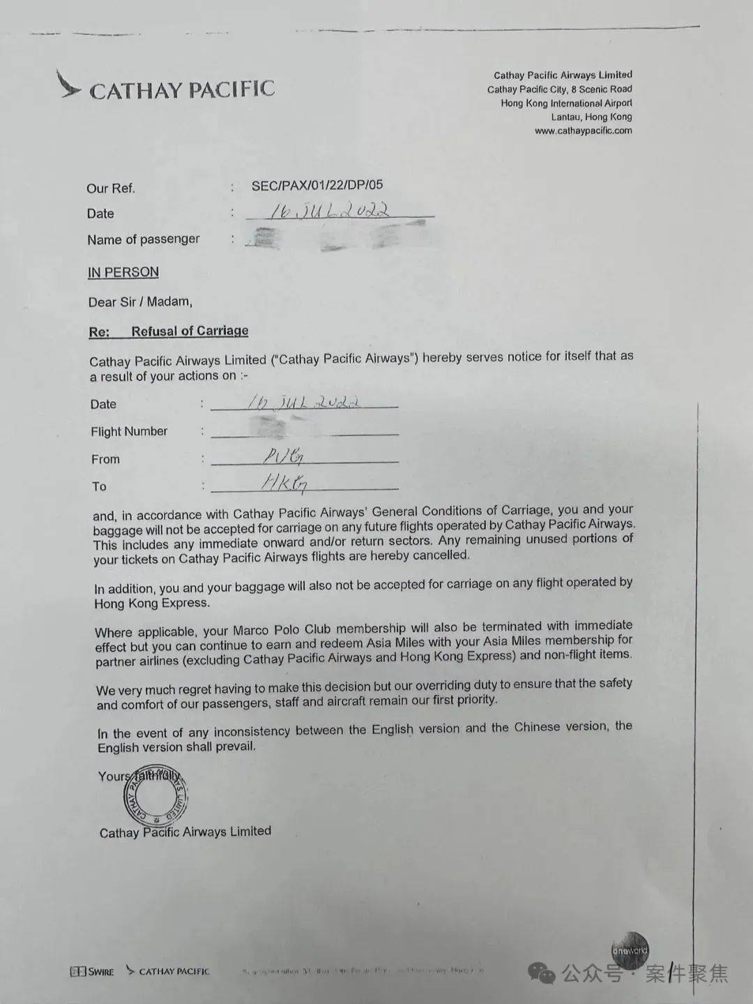 随后,方女士终于在行李箱找到了入境签证,因超过值机时间,她只好改签航班。再次办理值机时,她却收到一份《拒绝运输通知》,她被该航司永久拒载了。