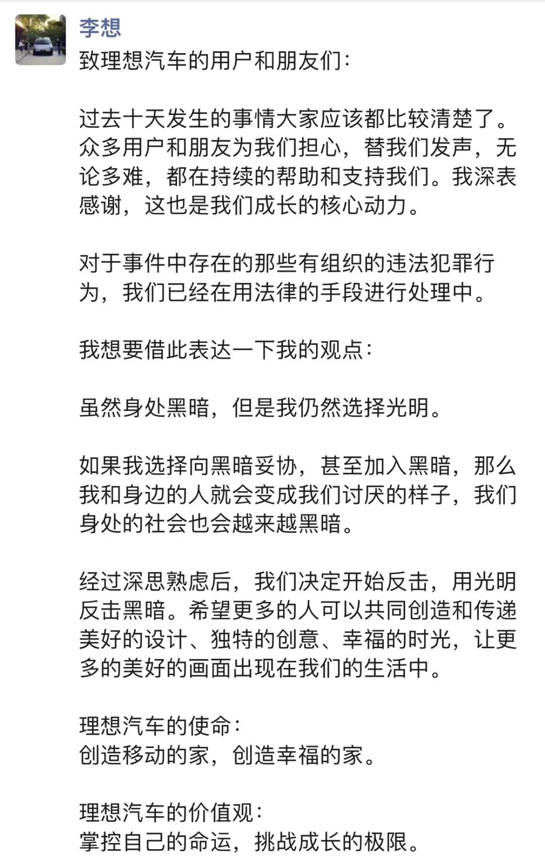 李想表示,对于事件中存在的那些有组织的违法犯罪行为,我们已经在用法律的手段进行处理中。