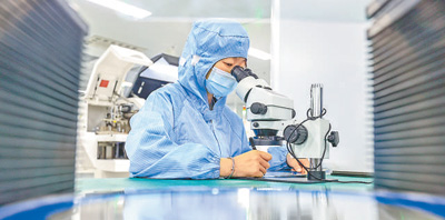 江西湖口县一家半导体公司车间,工作人员在检测芯片产品。吴江/摄