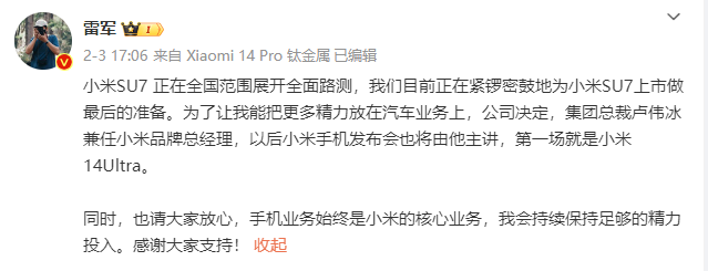 值得注意的是,在今年两会期间,雷军表示:“我在这里保证,我们全力以赴,一定把小米汽车干好、干成,不让全国的用户失望。”