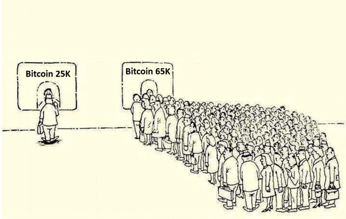 随着价格的不断走高,强者愈强的马太效应也开始在过去几周发挥作用,并吸引着越来越多的投资者投身其中。有圈内人士的一组漫画就颇为形象地显示,在价格此前回落长期处于25000美元时,比特币无人问津;而如今在升破65000美元后,比特币的门口则再度排起了长龙。