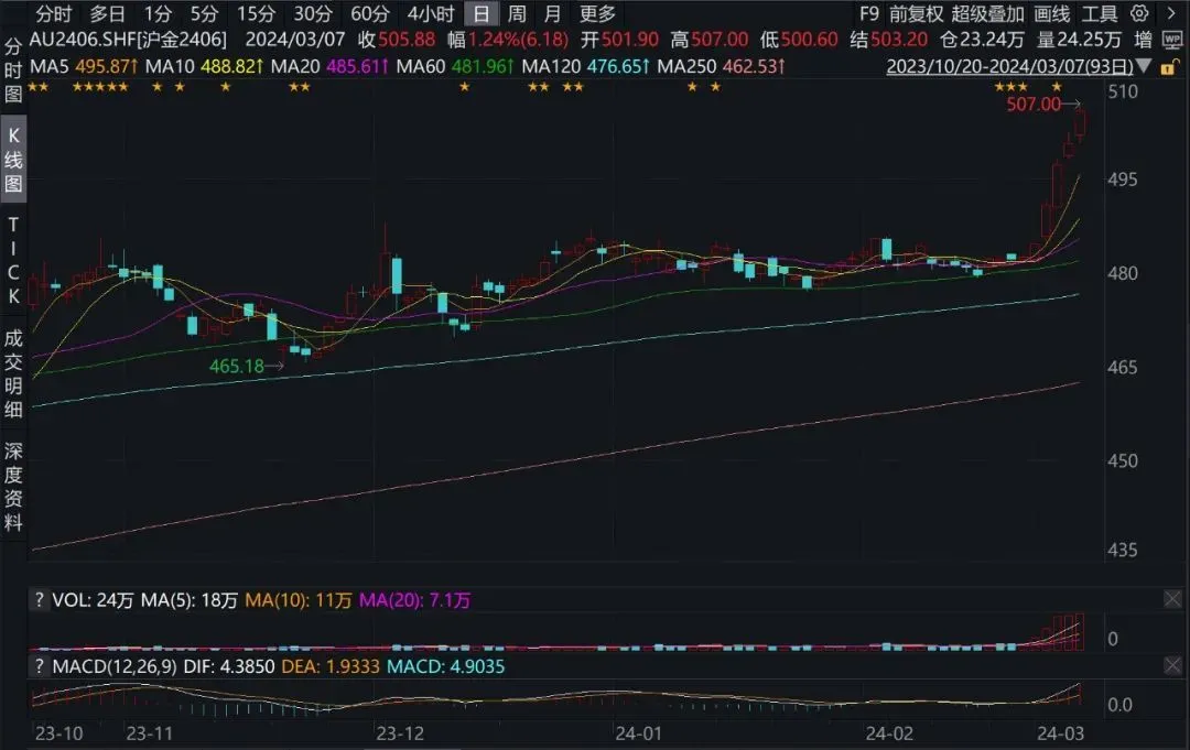 国内方面,沪金主连Au9999今日收盘报505.88元/克,上海黄金交易所金价也于近日首次突破500元。总体来看,国内、国际金价进入三月份后,皆实现了“五连涨”。