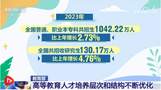 2023年,全国共有高等学校3074所,比2022年增加61所;各种形式的高等教育在学总规模4763.19万人,比2022年增加108.11万人;全国普通、职业本专科共招生1042.22万人,比2022年增长2.73%。种种数据显示,高等教育入学机会进一步增加。