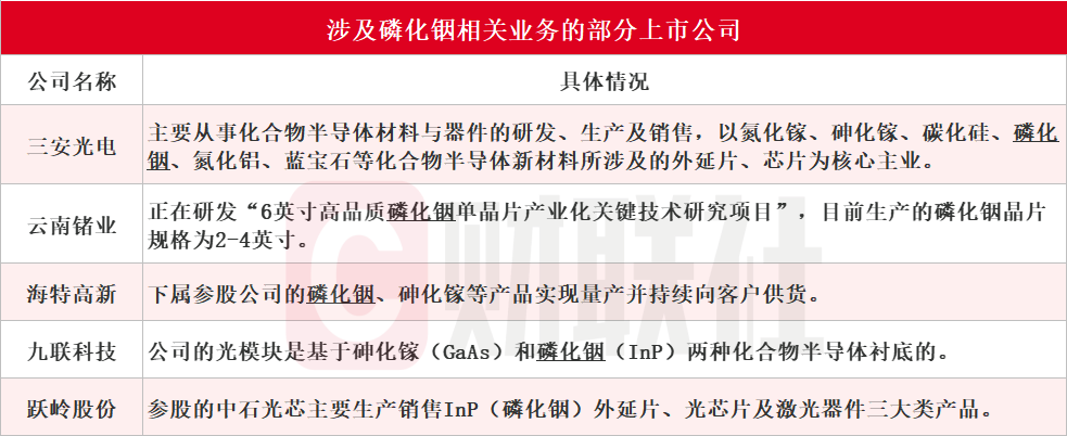 据不完全统计,涉及磷化铟相关业务的上市公司有三安光电、云南锗业、海特高新、九联科技、跃岭股份等,具体情况如下: