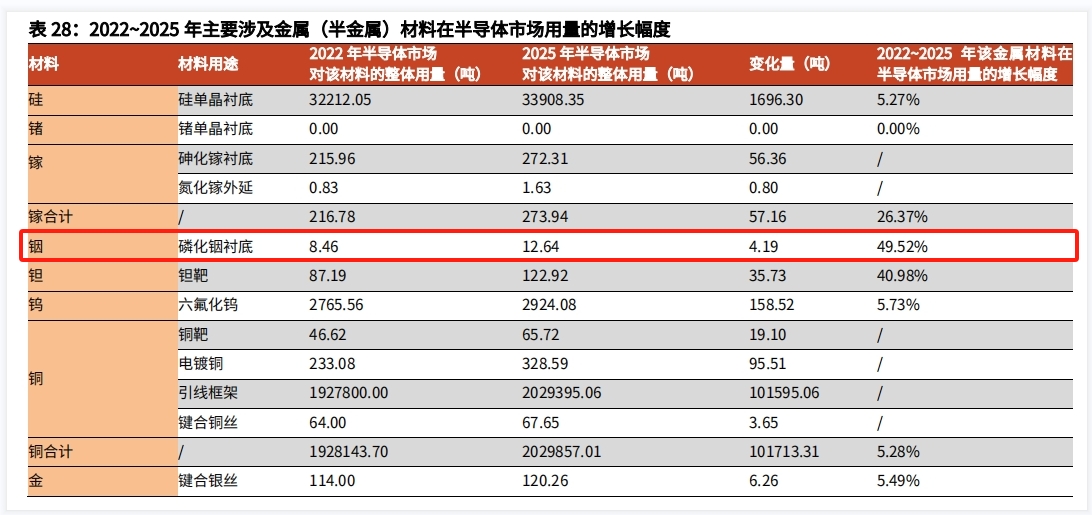 据悉,磷化铟属于第二代III-V族化合物半导体,是仅次于硅之外最成熟的半导体材料之一。当下,5G通信、数据中心等产业快速发展,驱动磷化铟下游光模块器件、高端射频器件等需求迅增,为磷化铟需求扩增提供了支撑。光大证券分析师王招华等人1月21日报告数据显示,2022-2025年铟在半导体市场(用作磷化铟衬底)用量的增幅接近50%。
