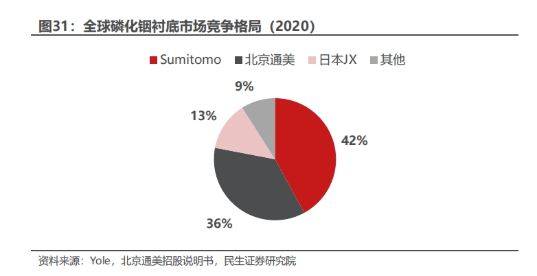 从市场格局来看,磷化铟衬底材料市场头部企业集中度很高,主要供应商包括日本住友、北京通美、日本JX等。据Yole数据显示,2020年全球前三大厂商占据磷化铟衬底市场90%以上市场份额。