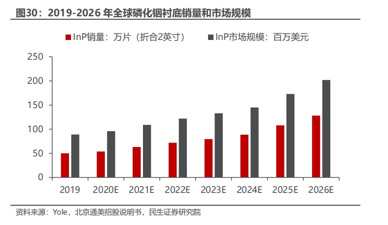 根据Yole预测,2019年全球磷化铟衬底市场规模为0.89亿美元,2026年全球磷化铟衬底市场规模为2.02亿美元,2019-2026年复合增长率为12.42%。