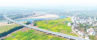 江西赣州市于都县车溪乡桃坑村,盛开的油菜花与民居、公路、河流等相映成趣,构成一幅春意盎然的美丽画卷。胡江涛/摄