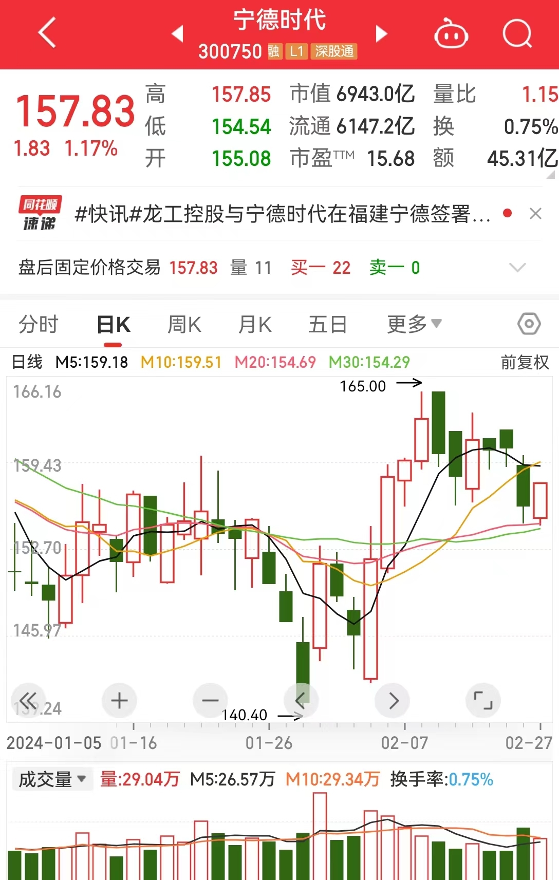 截至2月27日收盘,宁德时代(300750.SZ)报157.83元,市值6943.0亿元。