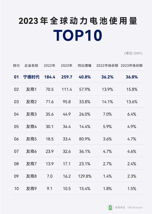另据CATL宁德时代官方微信号,近日,韩国电池和能源研究公司SNE Research发布了2023年全球动力电池使用数据,宁德时代连续7年,登顶全球第一。