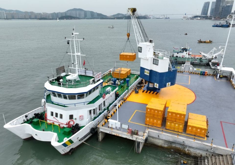 2024年1月25日,工作人员在厦门西堤海上环卫码头吊运海漂垃圾(无人机照片)。新华社记者 林善传/摄