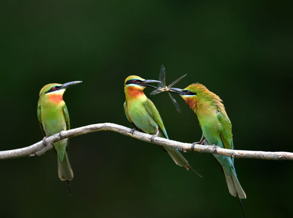 在厦门五缘湾栗喉蜂虎自然保护区骑马山片区,一只栗喉蜂虎雄鸟(右)给两只雌鸟喂食昆虫(2023年5月20日摄)。新华社记者 魏培全/摄