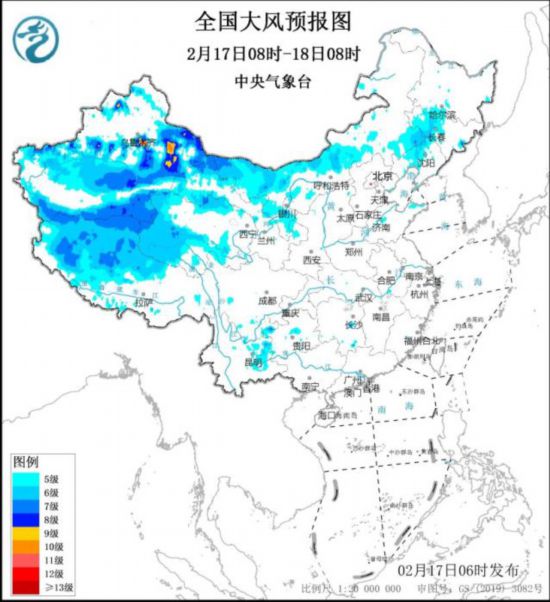 2月17日08时至18日08时,新疆北疆东部和南疆盆地、内蒙古中西部、青海西部、西藏西部、甘肃西部、辽宁西部、吉林西部等地将有5~7级、阵风8~10级的大风,新疆山口地区风力可达12级,阵风13~15级,2月18日08时至19日08时,新疆南疆盆地、内蒙古西部、青海西南部、西藏西部、甘肃西部等地将有5~6级、阵风7~9级的大风;渤海、渤海海峡、黄海大部海域、东海北部海域将有7~8级、阵风9级的大风。中央气象台2月17日06时继续发布大风蓝色预警。
