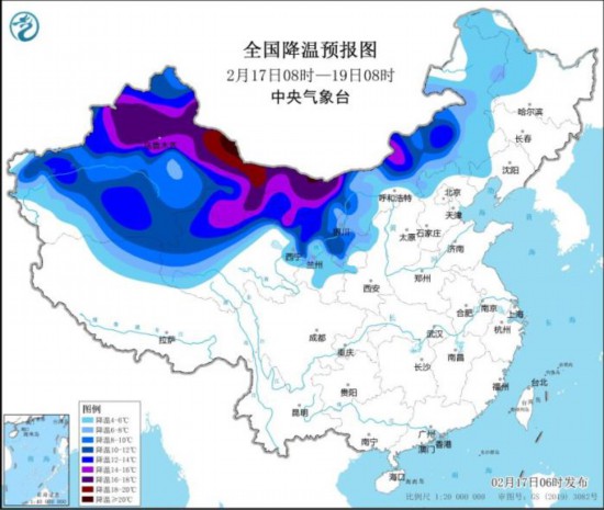 受寒潮影响,预计,2月17日至22日,我国大部地区将自西向东、自北向南先后出现剧烈降温,气温普遍下降8~12℃,新疆、内蒙古、西北地区东部、华北大部、东北地区、黄淮、江淮、江汉、江南、华南中北部及贵州等地气温将下降12~18℃,其中,新疆东北部、内蒙古、东北地区及湖北、湖南等地的部分地区累计降温幅度可达20℃以上。2月23日前后,最低温度0℃线将南压到苏皖南部、江西北部至湖南南部、贵州南部一带。2月17日08时至19日08时,新疆大部、内蒙古中西部、甘肃大部、宁夏、青海北部等地将先后降温6~12℃,其中,新疆东北部、内蒙古西部、甘肃河西等地部分地区降温可达12~20℃,局地20℃以上。中央气象台2月17日06时继续发布寒潮黄色预警。