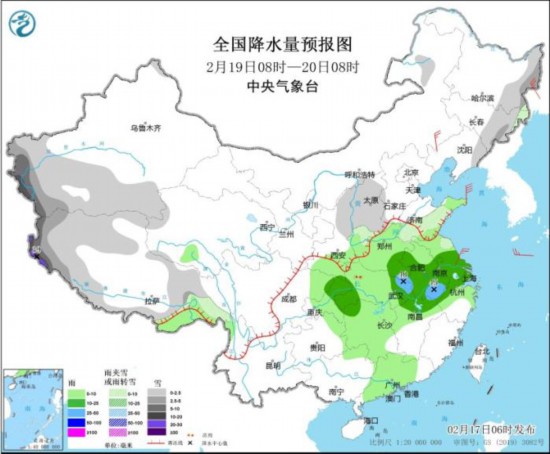 2月19日08时至20日08时,黑龙江东北部、吉林东部、新疆南疆西部山区、西藏西部等地部分地区有中到大雪,其中,新疆南疆西部山区、西藏西部等地部分地区有暴雪,西藏西部等地部分地区有大暴雪,局地特大暴雪(30~39毫米)。西北地区东南部、黄淮西部、江淮、江汉、江南北部和西部、西南地区东北部、广西北部、广东中西部等地部分地区有小到中雨,其中,河南南部、安徽南部、湖北东部等地部分地区有大雨(25~45毫米)。内蒙古东南部部分地区有4~5级风;渤海、渤海海峡、黄海大部海域、东海北部海域有6~7级风、阵风8~9级。