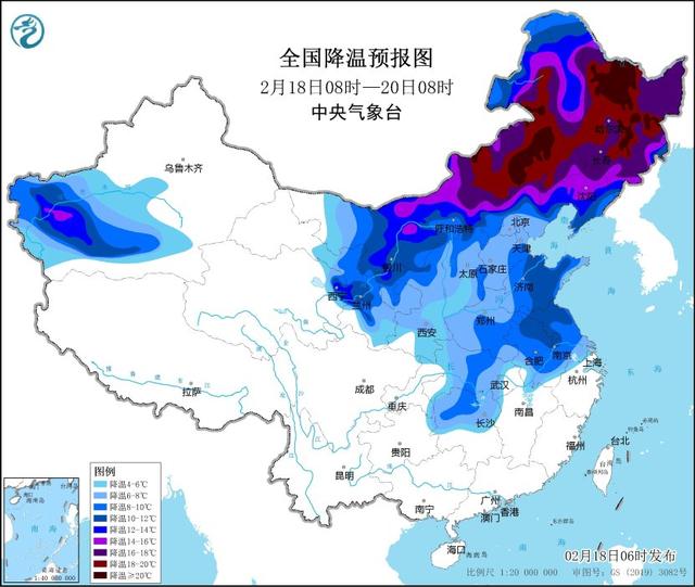 2月18日08时至20日08时,新疆南疆盆地、内蒙古大部、西北地区东部、华北北部、东北地区、黄淮、江淮、江汉、江南北部等地将降温6~10℃,其中,南疆盆地西部、内蒙古大部、东北地区大部等地降温12~16℃,局地可达18℃以上。