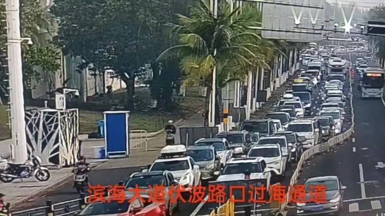 2月17日等待过海车流。图源/海南日报