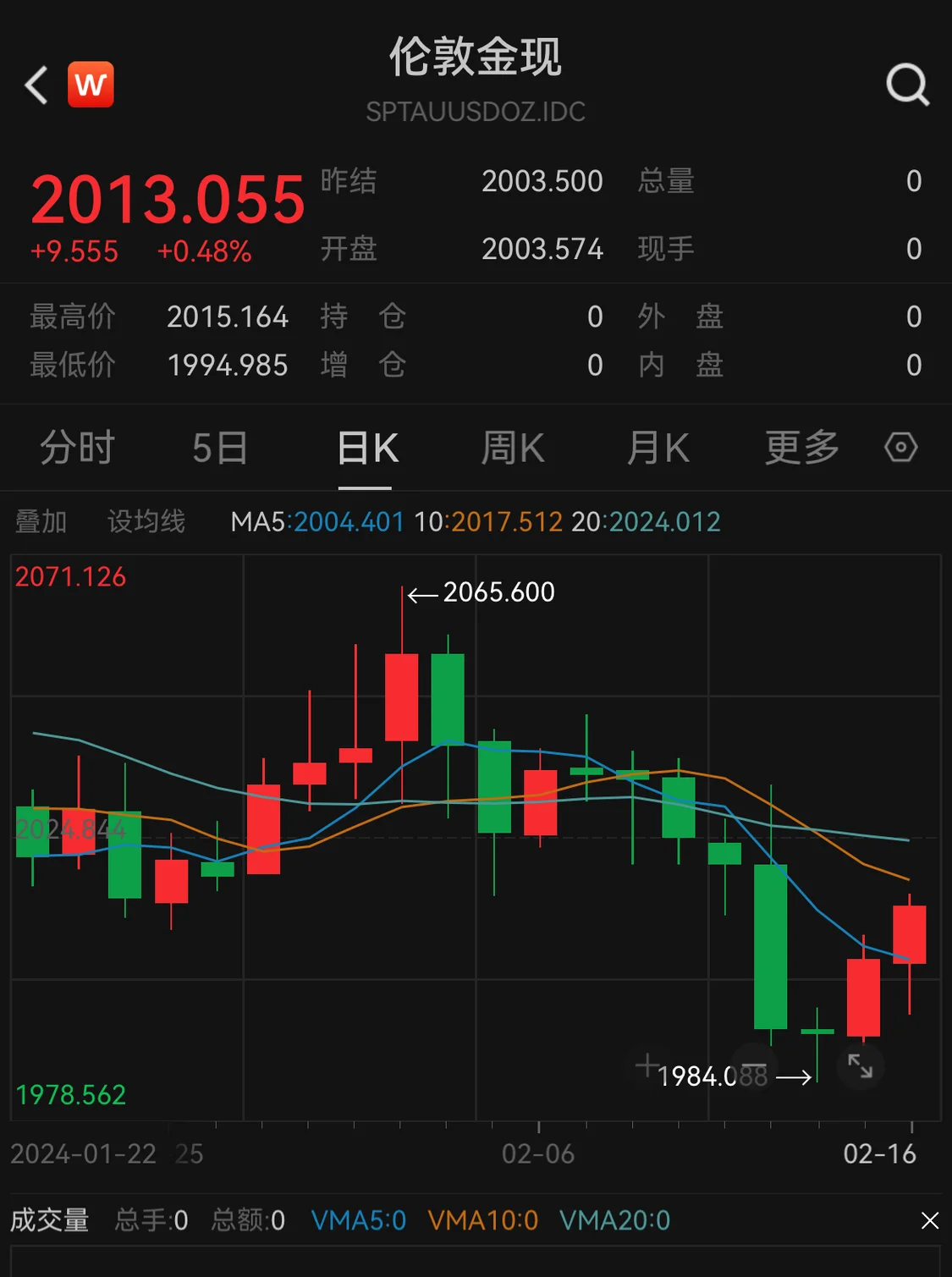 另外,伦敦黄金现货价格同样出现下跌。与COMEX黄金期货价格相同,均在2月13日和14日出现大幅下跌,并跌破2000美元/盎司。其中,2月13日大跌1.34%。截至发稿,伦敦黄金现货价格亦有所回升,报2013.055美元/盎司。