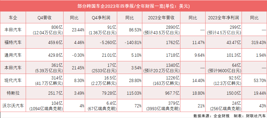 以此计算,丰田汽车2023年第四季度单日净利润高达约1亿美元,遥遥领先于其他已发布财报的竞争对手。