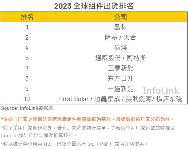 榜单显示第一梯队成员依然未变,晶科位列第一,隆基与天合并列第二,晶澳位居第四。晶科自2023年半年度出货量重回全球第一后全年守擂成功。