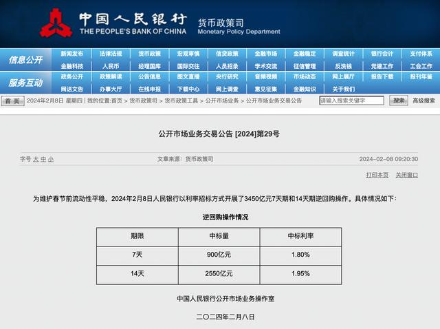 为维护春节前流动性平稳,2024年2月8日中国人民银行以利率招标方式开展了3450亿元7天期和14天期逆回购操作。具体情况如下: