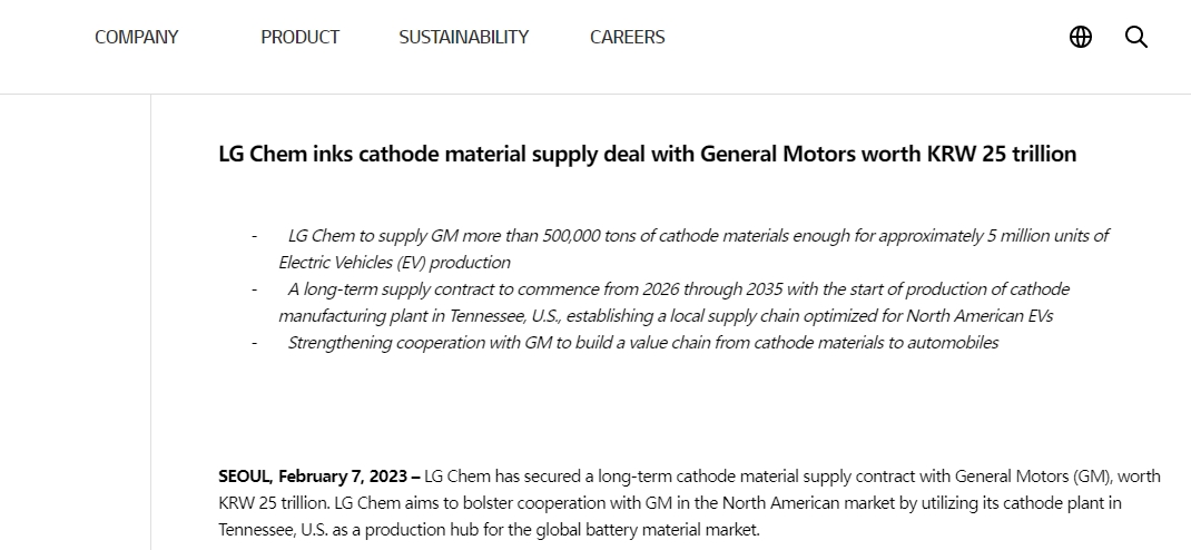 根据长期供应合同,LG化学将在2026-35年向通用汽车供应超过50万吨阴极材料(含镍、钴、锰、铝)。LG化学认为,估计的阴极材料总量将足以生产大约500万辆高性能电动汽车的电池。