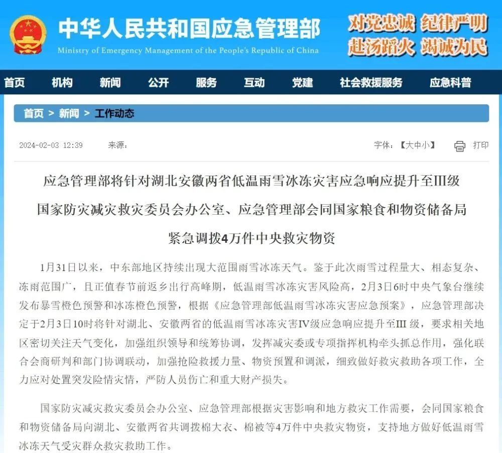 1月31日以来,中东部地区持续出现大范围雨雪冰冻天气。鉴于此次雨雪过程量大、相态复杂、冻雨范围广,且正值春节前返乡出行高峰期,低温雨雪冰冻灾害风险高,2月3日6时中央气象台继续发布暴雪橙色预警和冰冻橙色预警,根据《应急管理部低温雨雪冰冻灾害应急预案》,应急管理部决定于2月3日10时将针对湖北、安徽两省的低温雨雪冰冻灾害IV级应急响应提升至III 级,要求相关地区密切关注天气变化,加强组织领导和统筹协调,发挥减灾委或专项指挥机构牵头抓总作用,强化联合会商研判和部门协调联动,加强抢险救援力量、物资预置和调派,细致做好救灾救助各项工作,全力应对处置突发险情灾情,严防人员伤亡和重大财产损失。