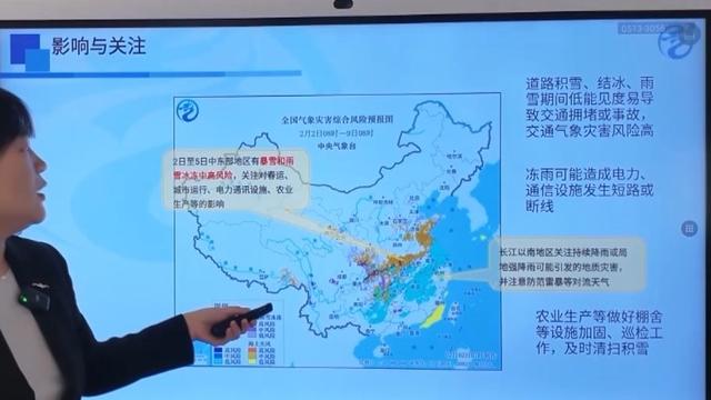 综合来看,2日至5日我国中东部地区,由于降雪量比较大,将会有暴雪和雨雪冰冻的中高风险。道路积雪、结冰、雨雪期间能见度低,可能导致交通拥堵或事故,大家返乡路上要注意交通安全。此外,冻雨可能造成电力通信设施发生短路或断线。农业生产方面,还是要做好棚舍等设施的加固巡检工作,及时清除扫雪。