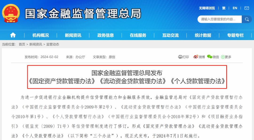 2月2日下午,国家金融监督管理总局发布了修订后的《固定资产贷款管理办法》《流动资金贷款管理办法》《个人贷款管理办法》,将于今年7月1日起施行,引发市场关注。