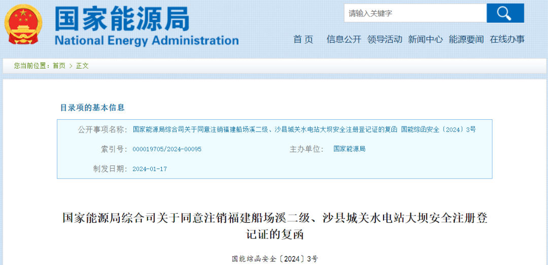 2月2日,国家能源局发布《关于同意注销云南石龙坝水电站平地哨大坝安全注册登记证的复函》《同意注销福建船场溪二级、沙县城关水电站大坝安全注册登记证的复函》。