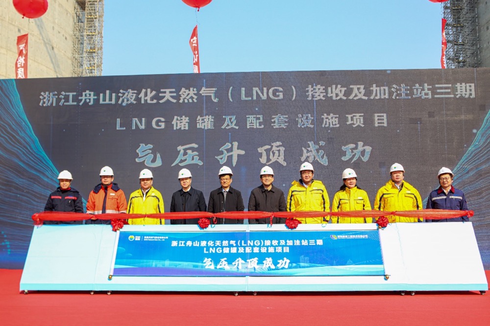 1月26日上午,历时222分钟,由新奥(舟山)液化天然气有限公司投资,新地能源工程技术有限公司EPC总承包、中核华兴、中核五公司承建的新奥舟山LNG三期储罐及配套设施6号储罐、7号储罐、8号储罐顺利实现“三顶”同升并到达预定高度,标志着三期储罐项目主体结构建设完成,全面进入内罐安装阶段,为后续顺利投产奠定坚实基础。