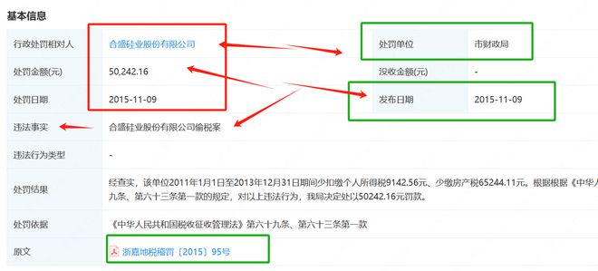 第一财经记者查询企查查,亦能查到合盛硅业偷税被行政处罚的记录。处罚结果显示,合盛硅业2011年1月1日至2013年12月31日期间少扣缴个人所得税9142.56元、少缴房产税65244.11元。嘉兴市财政局决定处以50242.16元罚款,处罚日期为2015年11月9日。