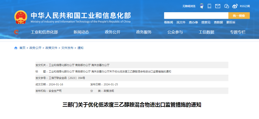 1月25日,工信部等三部门发布的《关于优化低浓度三乙醇胺混合物进出口监管措施的通知》指出,2月1日起优化部分低浓度三乙醇胺混合物进出口的监管措施。