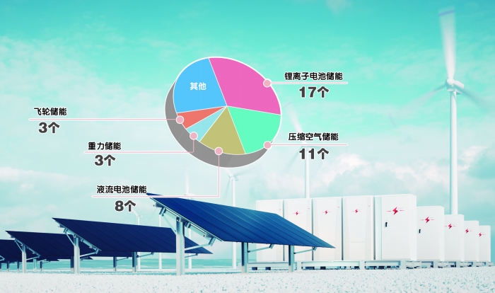 据记者统计,在56个示范项目中,锂离子电池储能示范项目最多,为17个,占比超过三成;其次为压缩空气储能,有11个项目入选;液流电池储能有8个示范项目入选;飞轮储能、重力储能等新技术示范项目均为3个。此外,钠离子电池储能、二氧化碳储能、液态空气储能等多个新技术路线也有示范项目入选。