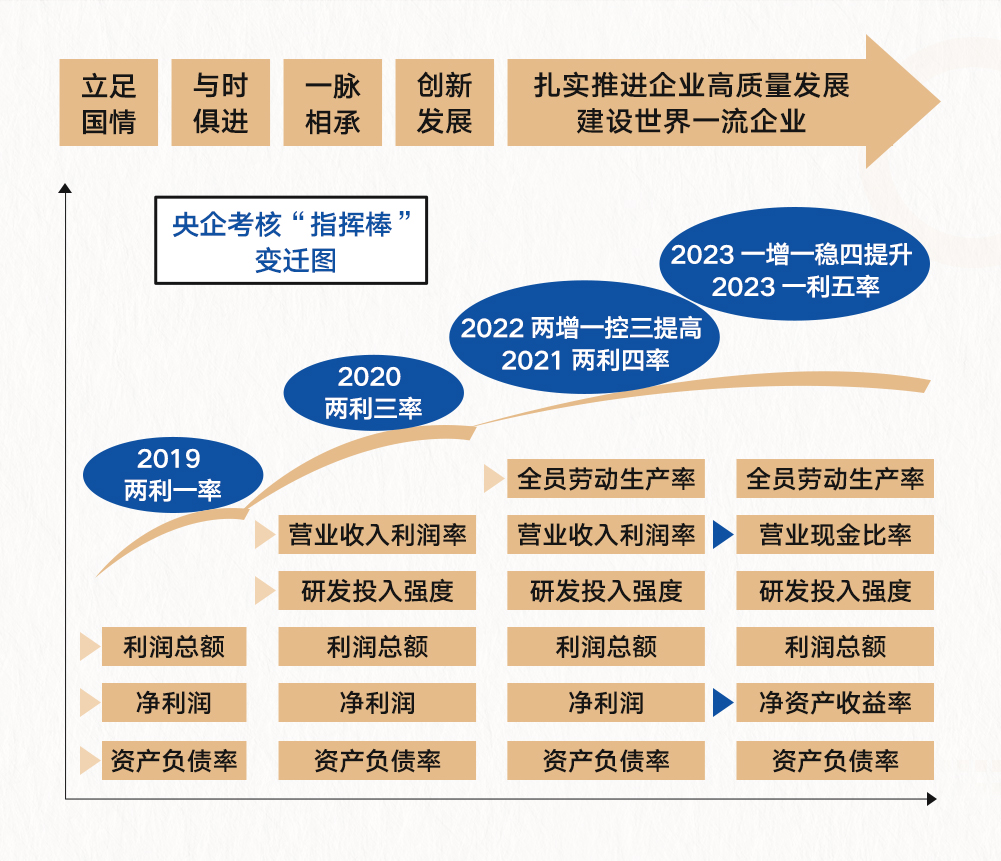 从2019年的“两利一率”到2020年的“两利三率”,再到2021年的“两利四率”和2022年的“两增一控三提高”,最后到2023年的“一增一稳四提升和一利五率”,这些央企经营方面的数据指标一直都在央企考核绩效评价体系之中,且越来越完善。