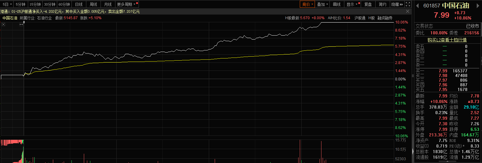 11月25日万亿巨头中国石油实现涨停,为2015年7月以来首次。截至收盘,涨幅为10.06%,股价报7.99元,市值达1.46万亿,成交金额为29.10亿元。