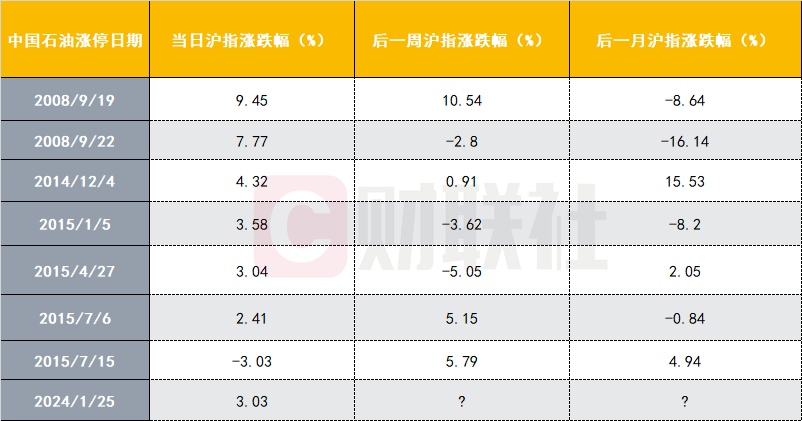 值得注意的是,中国石油的涨停是一个重要信号。中国石油一向被称为A股市场的“超级大象”,历史上的涨停次数屈指可数,即使碰到了涨停板,也很难封住。历史上,包括今天,中国石油到当日收盘共涨停8次,此前分别为2008年9月19日、2008年9月22日、2014年12月4日、2015年1月5日、2015年4月27日、2015年7月6日、2015年7月15日。
