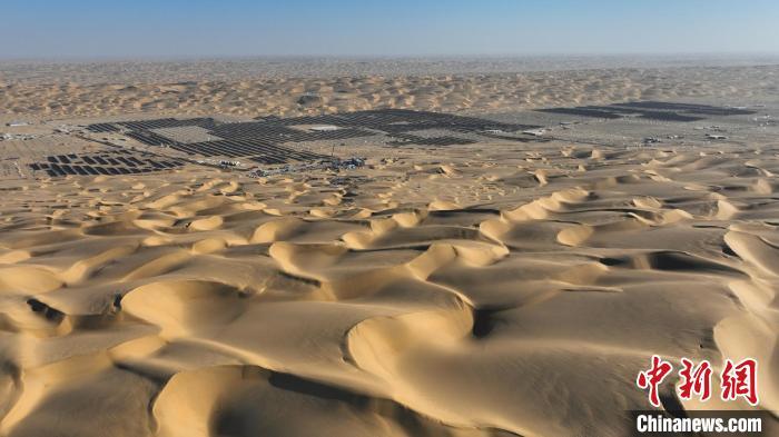 资料图:塔里木沙漠腹地陆续建起的光伏发电项目。 塔里木油田提供