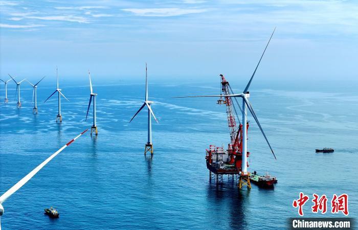 资料图:2023年6月28日,全球首台16兆瓦海上风电机组在三峡集团福建海上风电场顺利完成吊装任务。 吕明 摄