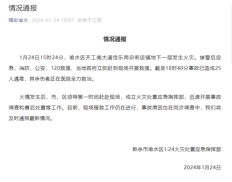 据新余市渝水区委宣传部“精彩渝水”公众号,1月24日15时24分,渝水区天工南大道佳乐苑沿街店铺地下一层发生火灾。接警后应急、消防、公安、120救援、当地政府立即赶到现场开展救援。截至18时40分事故已造成25人遇难,其余伤者正在医院全力救治。